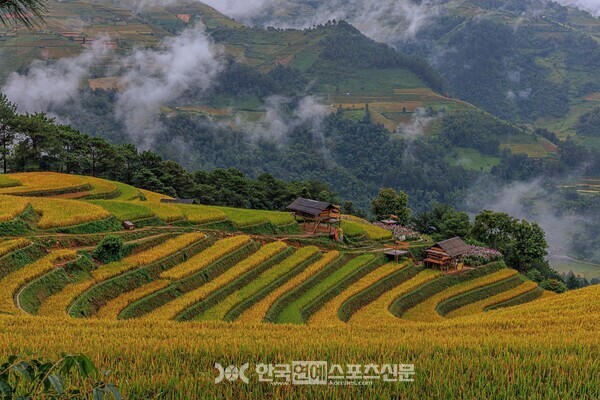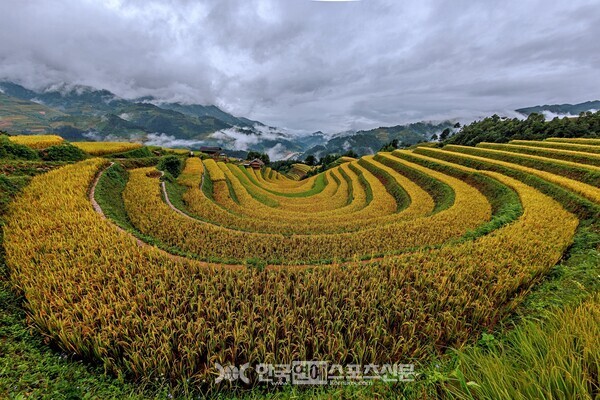 베트남 북서부 옌바이 지방에 자리한 무캉차이가 수확기의 색으로 가득 물들었다. 라판탄과 투레 일대에 펼쳐진 계단식 논은 9월부터 10월 사이 황금빛으로 익어가며 계절의 절정을 드러낸다. 산자락을 따라 부드럽게 휘어진 논의 곡선은 안개가 내려앉은 산 능선과 맞물려 독특한 지형미를 형성한다. 낮게 깔린 구름 사이로 드러나는 마을과 산림은 수확기의 고요한 분위기를 더해준다.