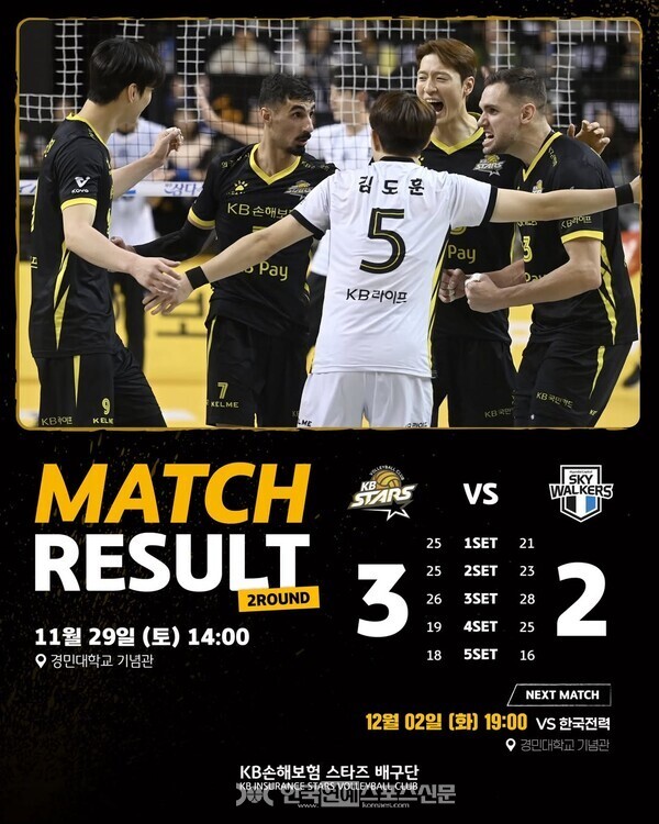 이 승리로 KB손보는 승점 2점을 추가해 시즌 7승4패 승점 21을 기록, 선두 대한항공 추격을 이어갔다.