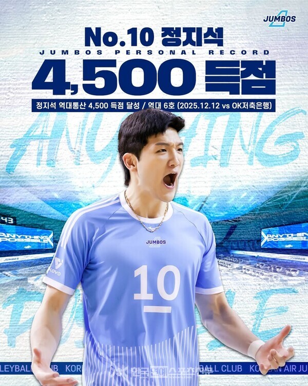 지난해 12월 12일 통산 4,500 득점을 달성한 정지석 / 출처 - 대한항공 점보스 인스타그램