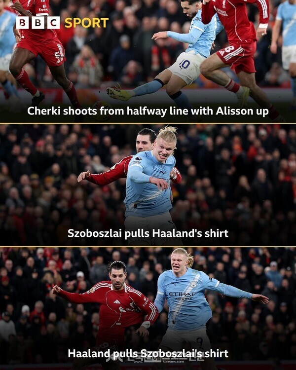 논란의 장면은 그 직후에 이어졌다. 리버풀이 동점을 노리며 알리송까지 세트피스에 올린 상황에서 맨시티가 공을 걷어냈고, 셰르키가 하프라인 부근에서 빈 골문을 향해 공을 찼다. 공이 천천히 굴러가면서 홀란과 소보슬러이가 이를 쫓는 추격전이 시작됐다.