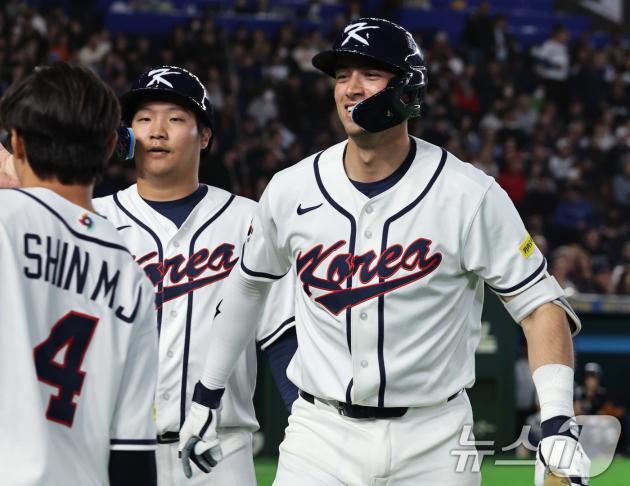 5일 오후 일본 도쿄돔에서 열린 2026 월드베이스볼클래식 C조 1차전 대한민국과 체코의 경기. 대한민국의 5회말 1사 1루 상황때 셰이 위트컴이 투런 홈런을 친 뒤 문보경과 기쁨을 나누고 있다. 2026.3.5 ⓒ 뉴스1 구윤성 기자