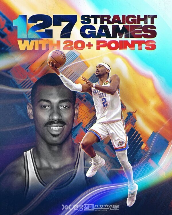 미국 프로농구(NBA) 오클라호마시티 선더의 셰이 길저스-알렉산더(SGA)가 127경기 연속 20득점 이상을 기록하며 윌트 체임벌린의 종전 최다 기록을 60여 년 만에 경신했다.