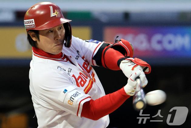1일 인천 미추홀구 문학야구장에서 열린 '2026 신한 SOL KBO리그' 키움 히어로즈와 SSG 랜더스의 경기, SSG 랜더스 최정이 1회말 2아웃 상황에서 안타를 치고 있다. 2026.4.1 ⓒ 뉴스1 이호윤 기자