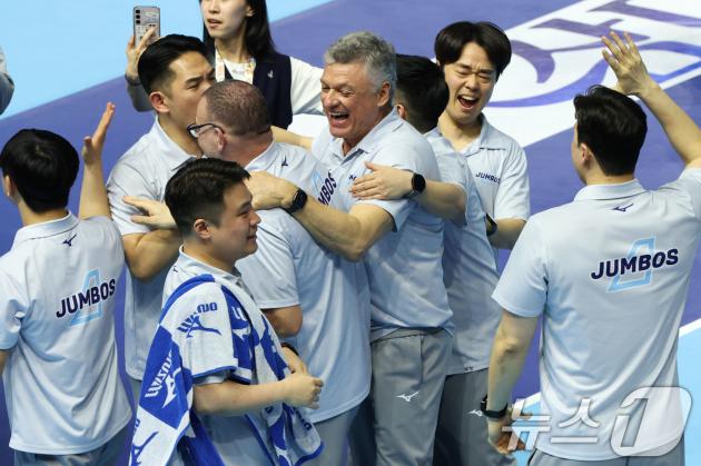 헤난 달 조토 대한항공 감독이 2일 오후 인천 계양체육관에서 열린 프로배구 2025-2026 V리그 남자부 챔피언 결정전 1차전 현대캐피탈과의 경기에서 세트스코어 3대 2로 승리를 거둔뒤 코치진과 기쁨을 나누고 있다. 2026.4.2 ⓒ 뉴스1 이광호 기자